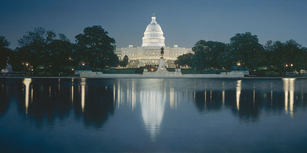 Photo-realist Rod Chase is particularly taken with any scene that features strong reflections. He has traveled to Washington, D.C., to see and photograph the more important buildings close-up in order to have a record of accurate architectural detail. Then, painting a moody scene like this one, he has to decide how much detail to keep and how much to lose because it detracts from the basic composition. His most popular pieces, Liberty’s Light and Dawn’s Early Light, both featured reflections as a key – if not the key – element.