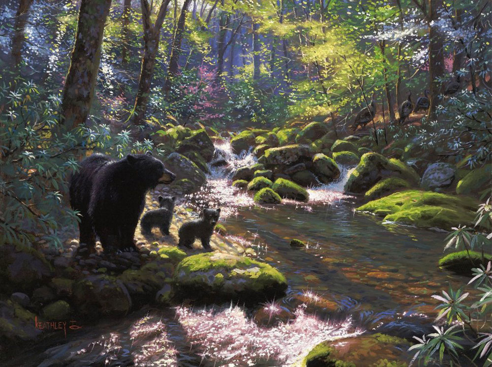 These two little fellas are experiencing for the first time a world waking up from the sleep of winter. New smells, colors, and sounds meet their senses as they step out into the wild under the watchful care of their mother. I created this small painting as a study for Seasons of Life II and it sold at a show in the spring of 2011. The couple that bought it brought it to me to be signed on the back at an event in 2011 this fall in Gatlinburg and everyone in the room said they wanted it! So we decided to bring it to life as a limited edition mini for your enjoyment.