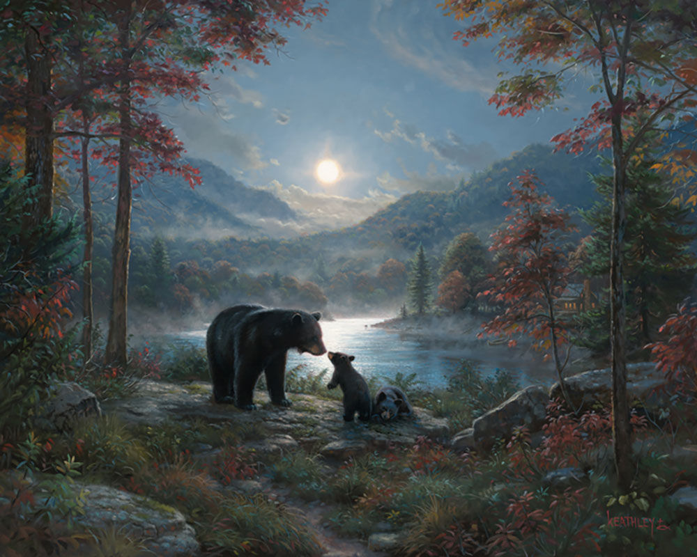 For many years now I have been the lone person (that I know of) who has not seen a bear in the mountains around Gatlinburg. It has become a joke amongst my friends, because bears are seen so often there. Therefore, I depend on my photos from bears in captivity for my paintings. This is probably a good thing, because I’m such a realist that I might not ever paint something as cute as Bedtime Kisses. Left up to my imagination, bears take on more of a storybook persona and less of a foraging wild thing. In this painting I am appealing to our inner nature to nurture. Sometimes in the business of life, we forget what is important and chose to spend time on the urgent. I hope this scene reminds you of what is the most valuable of all – the people around you. So, please, step out of the urgent during your day and take time to spread the love with laughter, tender moments and Bedtime Kisses.