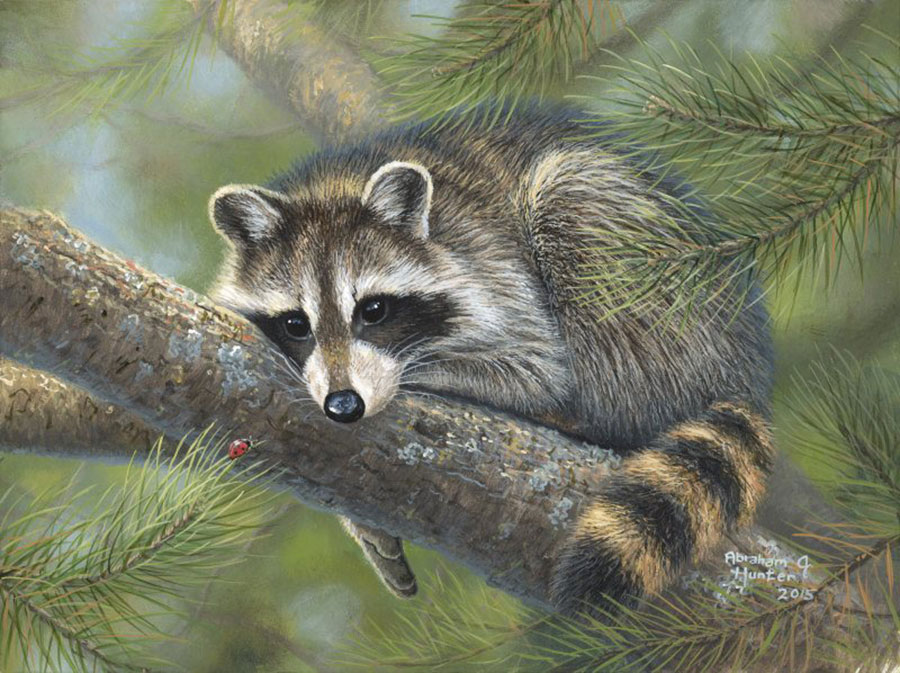 Early this spring, my brother and his wife stumbled upon two baby orphaned raccoons. I quickly volunteered to assume the role of daddy (and mother) so as to take good care of them. They were barely two weeks old and kept me up every two hours to feed them from a bottle and cuddle them. My sister gave them their names; these masked bandits deserved, Bonnie and Clyde. They were the sweetest pets I’ve ever had, and kept me company for weeks in my studio. They’re now living happily with other raccoons on a wildlife refuge and even though I’m sure they don’t remember me, I will always remember the precious moments I spent with them. I took painstaking time on their portraits, and I tried to capture their individual personalities. Clyde had bigger, floppy ears and always had a cute bewildered look on his face while he followed his big sister around. Bonnie was extremely curious, very vocal, and was a big mischief maker to say the least. These paintings of them hold a very special place in my heart, and I’m so glad you’ve given me the chance to share these paintings of my kids with you.