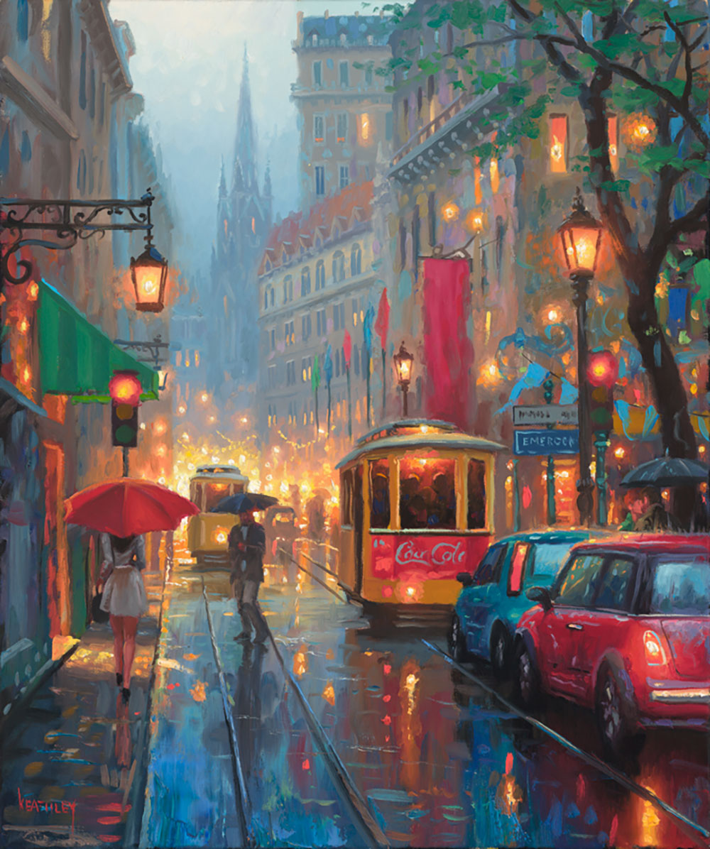 Inspiration doesn’t come sitting in a studio; one must get out and live! For some, this might be climbing a mountain or going fishing, but for Bonnie and me, it is traveling. What comes from my easel and brushes is a reflection of my personal encounter with the world. If I only stayed at home and painted, I imagine my paintings would take on a similar look where trees and rocks all begin to look the same, and the color of the atmosphere and types of clouds which fill my skies would never vary. Experiencing the world, however, sheds new light,  introduces new subjects, and pushes new colors in my work. This painting stands out from all of the rest. Bonnie came to me with an idea for an art wall in our guest bedroom and had several thoughts for paintings that she wanted to see and hang all together. She provided me with a file of photos that had caught her attention – images that made her heart dance with delight. So… we combined some pictures from Paris, San Fransisco, and even Asheville NC along with a misty atmosphere and wet streets. We added the light emanating through a wet windshield which kind of blurs and stirs all the colors before you as if you are driving down this avenue. She and I bring to you a traveler’s delight and a dance of radiant sparkles — where lovers kiss and chance encounters stir the heart here in “City Lights.”