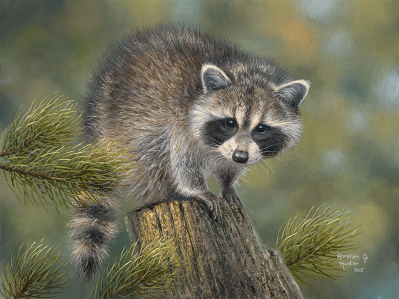 Early this spring, my brother and his wife stumbled upon two baby orphaned raccoons. I quickly volunteered to assume the role of daddy (and mother) so as to take good care of them. They were barely two weeks old and kept me up every two hours to feed them from a bottle and cuddle them. My sister gave them their names; these masked bandits deserved, Bonnie and Clyde. They were the sweetest pets I’ve ever had, and kept me company for weeks in my studio. They’re now living happily with other raccoons on a wildlife refuge and even though I’m sure they don’t remember me, I will always remember the precious moments I spent with them. I took painstaking time on their portraits, and I tried to capture their individual personalities. Clyde had bigger, floppy ears and always had a cute bewildered look on his face while he followed his big sister around. Bonnie was extremely curious, very vocal, and was a big mischief maker to say the least. These paintings of them hold a very special place in my heart, and I’m so glad you’ve given me the chance to share these paintings of my kids with you.