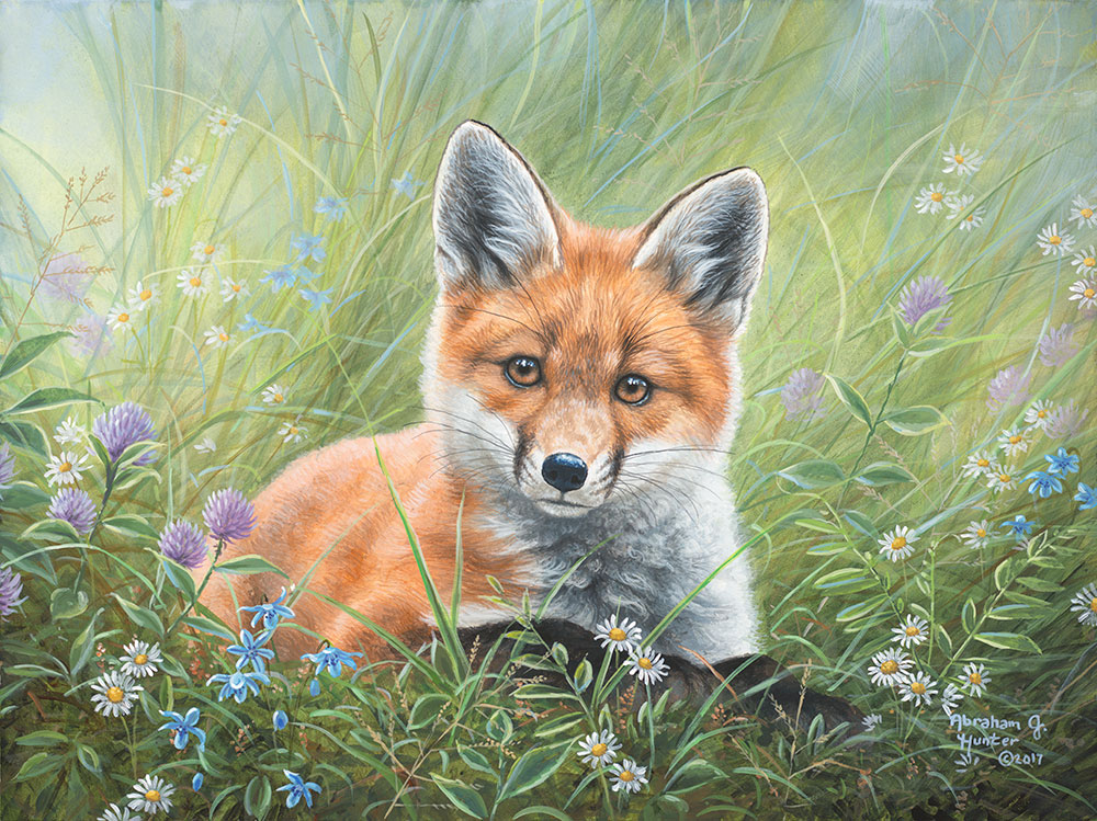“This is one of my favorite paintings because it captures the personality and inquisitiveness that baby animals have. This cute little kit has spotted you and is curious to see if you’re his new friend.”