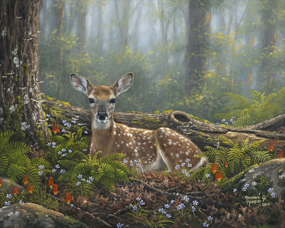 On a misty spring morning deep in a hardwood forest, the early morning light casts its gentle rays through the canopy of leaves and softly illuminates a newborn whitetail fawn. This curious little guy has seen you and is greeting you with his inquisitive stare. His white spotted coat blends in with the dapples of sunlight and the freshly bloomed spring wildflowers. Soon, he will jump up and run off to find his mother. I’ve tried to capture this precious moment in nature for you to enjoy forever. I hope this Endearing Fawn blesses you with its beauty, and that you never take for granted all that Our Creator has so graciously given us..