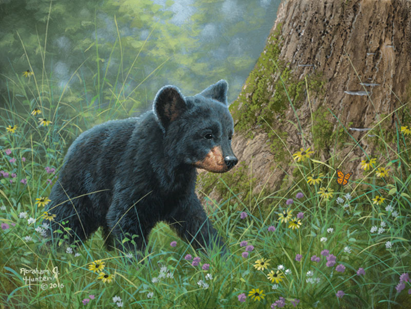 This little black bear cub reminds me of a puppy dog. He’s curious, energetic, and very likely to get in to trouble. He has left his mother’s side and is bravely exploring his blossoming spring home. This painting captures the moment that he approaches a butterfly to make his first new friend. I hope you all enjoy this painting…