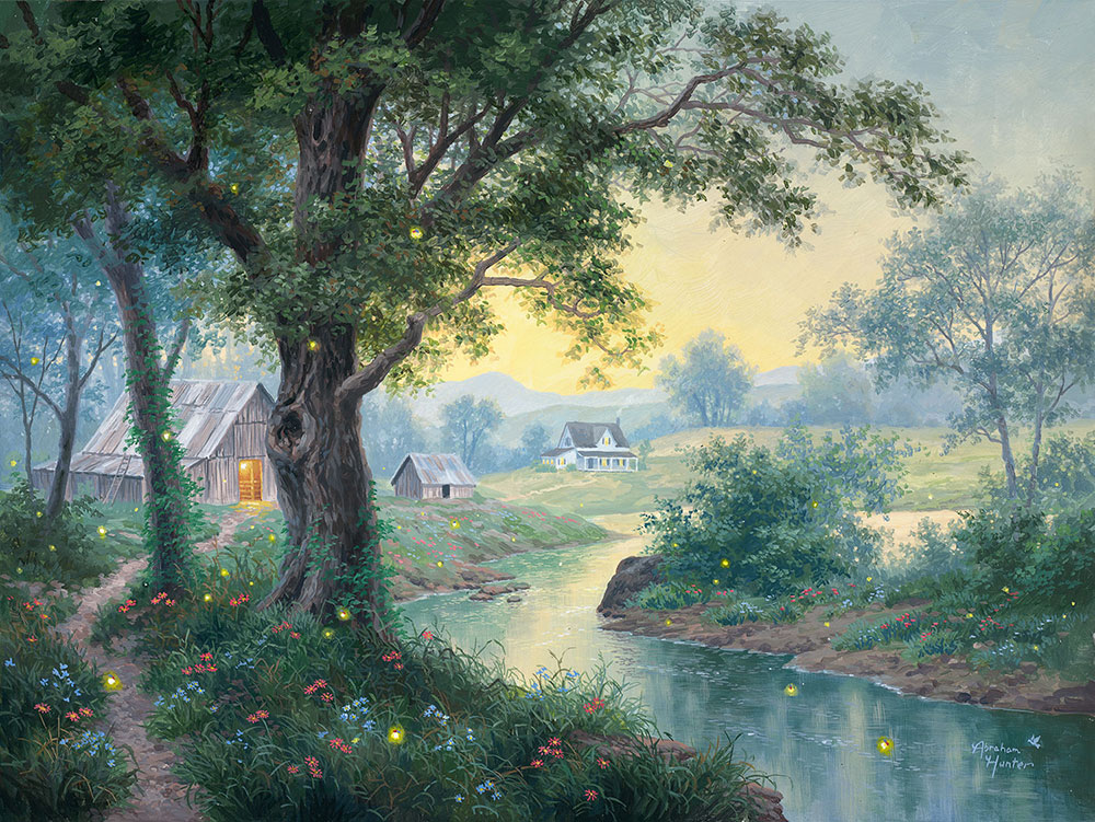 I did this painting recently of a perfect summer evening on the farm. A mist has begun to settle on the valley, and the fireflies are busy lighting up all over. One of my favorite parts about painting this was taking all the painstaking hours to add in each little leaf in the tree that has been silhouetted by the soft sunset. I hope this piece brings you peace and makes you feel at home.