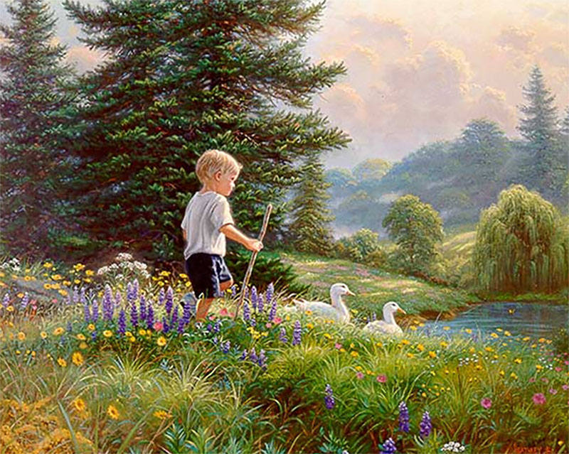 Grand Adventure by Mark Keathley ~ The desire to set out and explore in the boundaries of their universe is as natural as a duck’s desire to go to water. These adventures develop a love for learning. The child becomes a student of nature, noticing the way life works. There is time to “consider” all the lessons that can be learned from Mr. Ant, Wooley the Worm, and Madam Butterfly. Remembering his early days in the country, Mark Keathley would often say, “Who could sit around and be bored when there is so much to see out there” on a Grand Adventure.