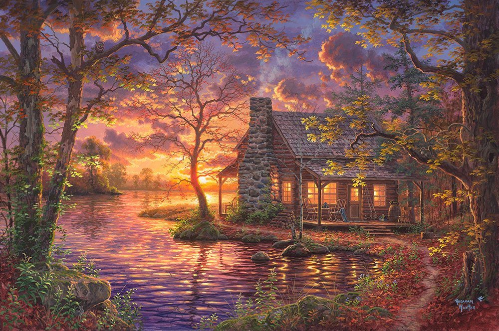 My day often starts with an abrupt alarm followed by a mental shock into reality of all that I “have” to have done by the end of the day before I pick up my phone to see who said what to me and what disaster befell mankind somewhere across the world while I slept. Then, I get my caffeine rush to propel me until it’s time to reboot for the whole process to begin the next day. That scenario is actually a very good life compared to most in America! Overworked and overstressed, most of us just barely do what it takes to get throught the work week. When the Psalmist felt overwhelmed, he wrote about a special place where he found comfort. He called his relationship with God, his “Hiding Place.” When we are too busy with ourselves, our  problems become larger than they really are, and our cares choke out the joy that life’s journey holds. A secluded cabin, like in this painting, is the perfect spot to be still and let life come back in to perspective. I created this painting to be your hiding place, a place to go to cast your cares on Him. Psalm 119:114 “You are my hiding place and my shield; I wait for your word.” I hope that it brings your heart peace each time your eye steps inside and you go to your “Hiding Place.”