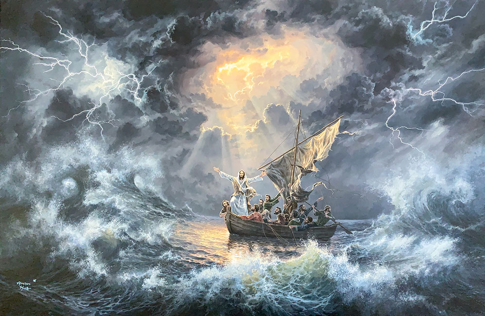 One day I got to my studio and found myself humming “In The Eye Of The Storm” for some reason, and I played it on YouTube. About halfway through, some of the words hit me hard, and I felt like expressing how I wanted God to part the dark roaring waves of my life and give my mind some peace. A couple of weeks earlier, my wife had drawn a sketch of Jesus calming the storms. I taped her sketch up to the wall for reference, grabbed the largest canvas in my studio, and immersed myself in the story of Jesus commanding the wind and weather to be at peace. I just finished this 28”x42” the other day, and it’s amazing to me that my mind seems to be more at peace already. I guess I learned from my own painting. In this painting, I tried to capture the bewildered disciples and the mass of confused dark waves that had made them afraid for their lives. This tangled mass of waves and storm clouds races away from the power of Jesus’ command to be still, and the eye of the storm breaks as heaven’s light pours down on the peaceful waters surrounding the boat. After painting this, now when I read the story of Jesus calming the seas, I see it with through new eyes. Fear had ruled the waves of the sea and the minds of the disciples, but when Jesus stood up and stretched out His arms, it was the turning point in the storm! Enough was enough! Darkness could not keep running the show anymore! It was time for peace! “In The Eye Of The Storm,” Jesus remains in control of everything!