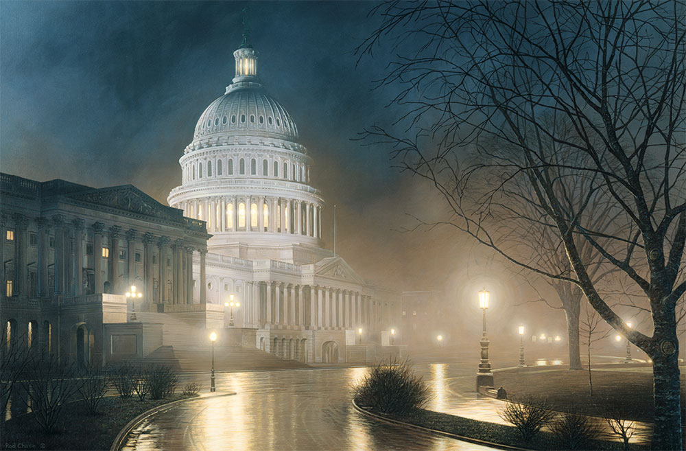 The United States Capitol is probably Rod Chase’s most popular subject. In “Land of Liberty”, we see the lighted building through a mist that softens the whole world surrounding it, making it seem as though it were totally isolated.